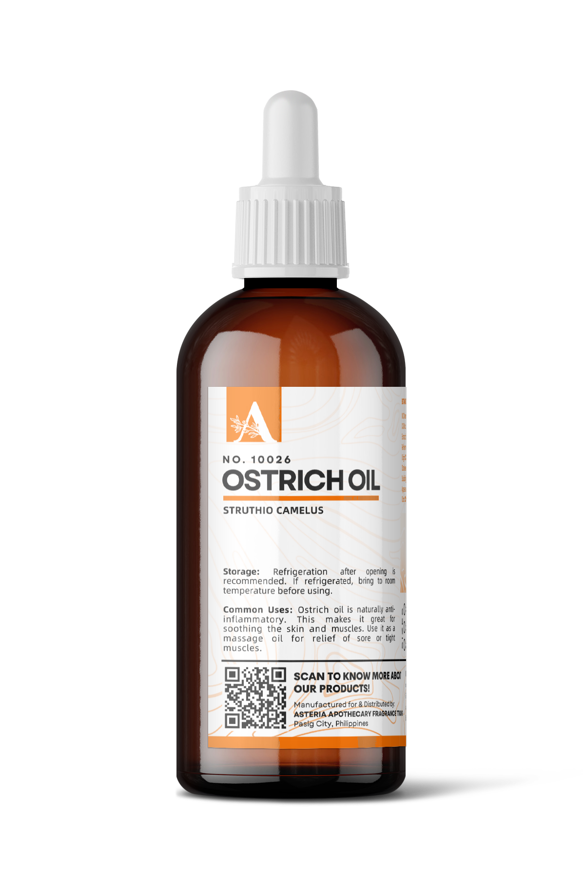 | Common uses | Ostrich oil is naturally anti-inflammatory. This makes it great for soothing the skin and muscles. Use it as a massage oil for relief of sore or tight muscles. May also be used for hair care products. |